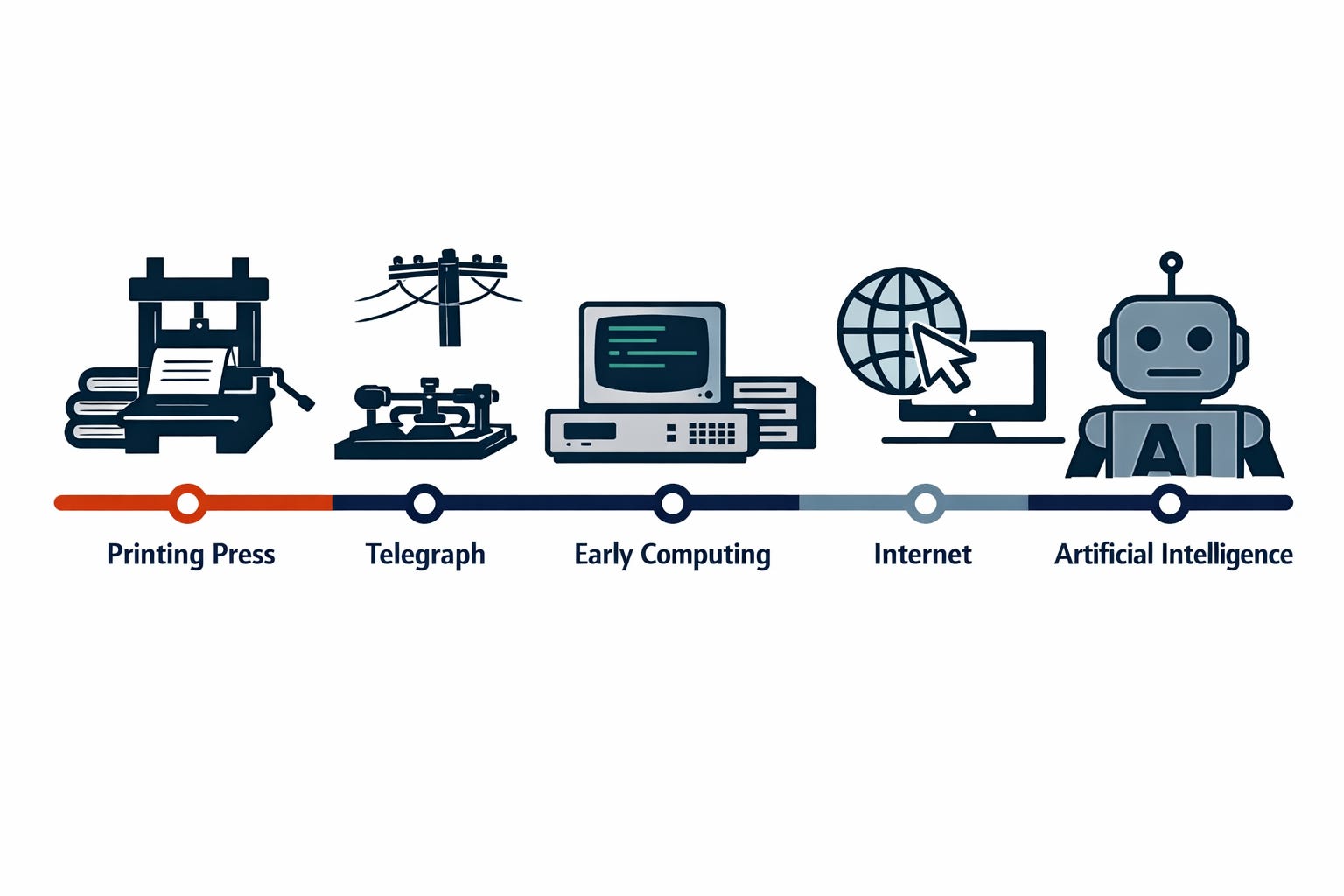 First and foremost, LLMs do not represent a radical departure from the history of information technology. We hear about artificial intelligence as if it marks a clean break in humanity’s technological trajectory; machines that can not only think but improve themselves. Too often we get caught up in science fiction mythology and overlook a simpler reality. These systems are sophisticated predictive engines, trained at unprecedented scale on the vast library of existing human writing. When we consider the machine to serve as a line of transmission that can extract and repackage existing knowledge, it starts to more closely resemble prior information technologies albeit with a far broader scope and scale.