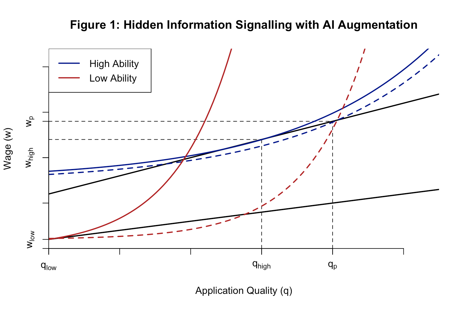 Figure 1: The diagram illustrates a signalling model with asymmetric information, showing how AI augmentation reduces the cost of application material for low-ability workers, thereby shifting the labour market from a separating to a pooling equilibrium in the wage–quality space.